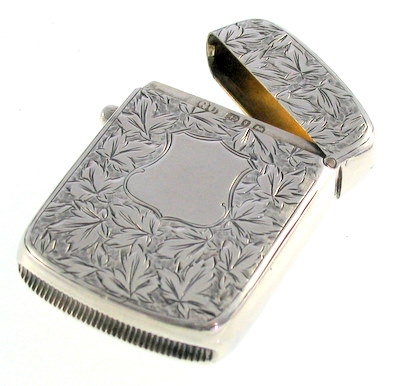 Silver vesta hallmarked Birmingham 1890-1 George Unite & Sons, with leaf engraving and push button opening.