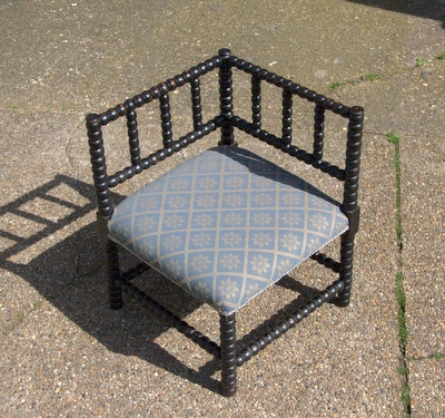 A nice ebonised beech bobbin turned corner chair with upholstered seat.
