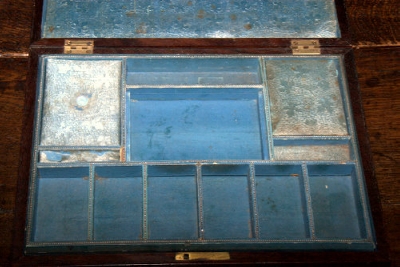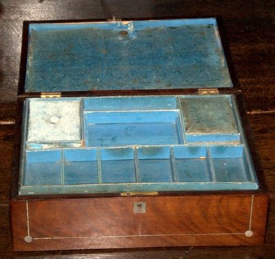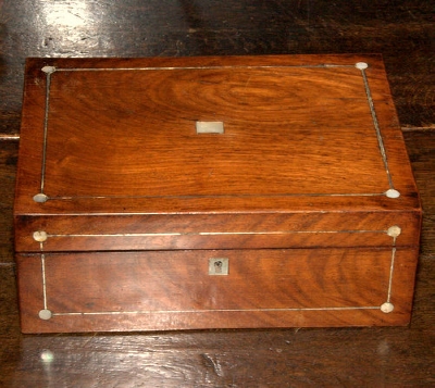 A lovely rosewood work box in good condition with mother of pearl decoration and original fitted interior.
