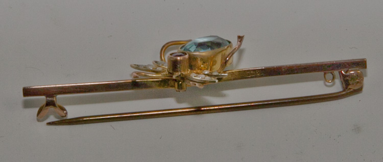 A faceted Aquamarine for the body and a garnet for the head with small sead pearls on the wings.