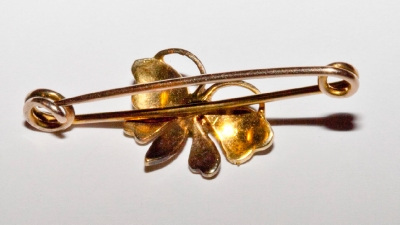 A lovely 15ct gold pin brooch of a small insect set with seed pearls and a green faceted stone