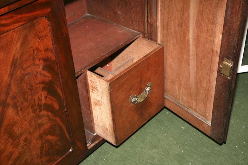 There are two mahogany lined drawers. The two-door cupboard with matching veneers below contains the original fitted wine drawer with brass pull handle.