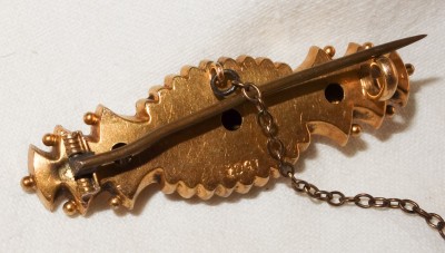 15ct gold Victorian brooch with onlaid foliate decoration, 2 small rubies and 1 small diamond clawset within star motifs.