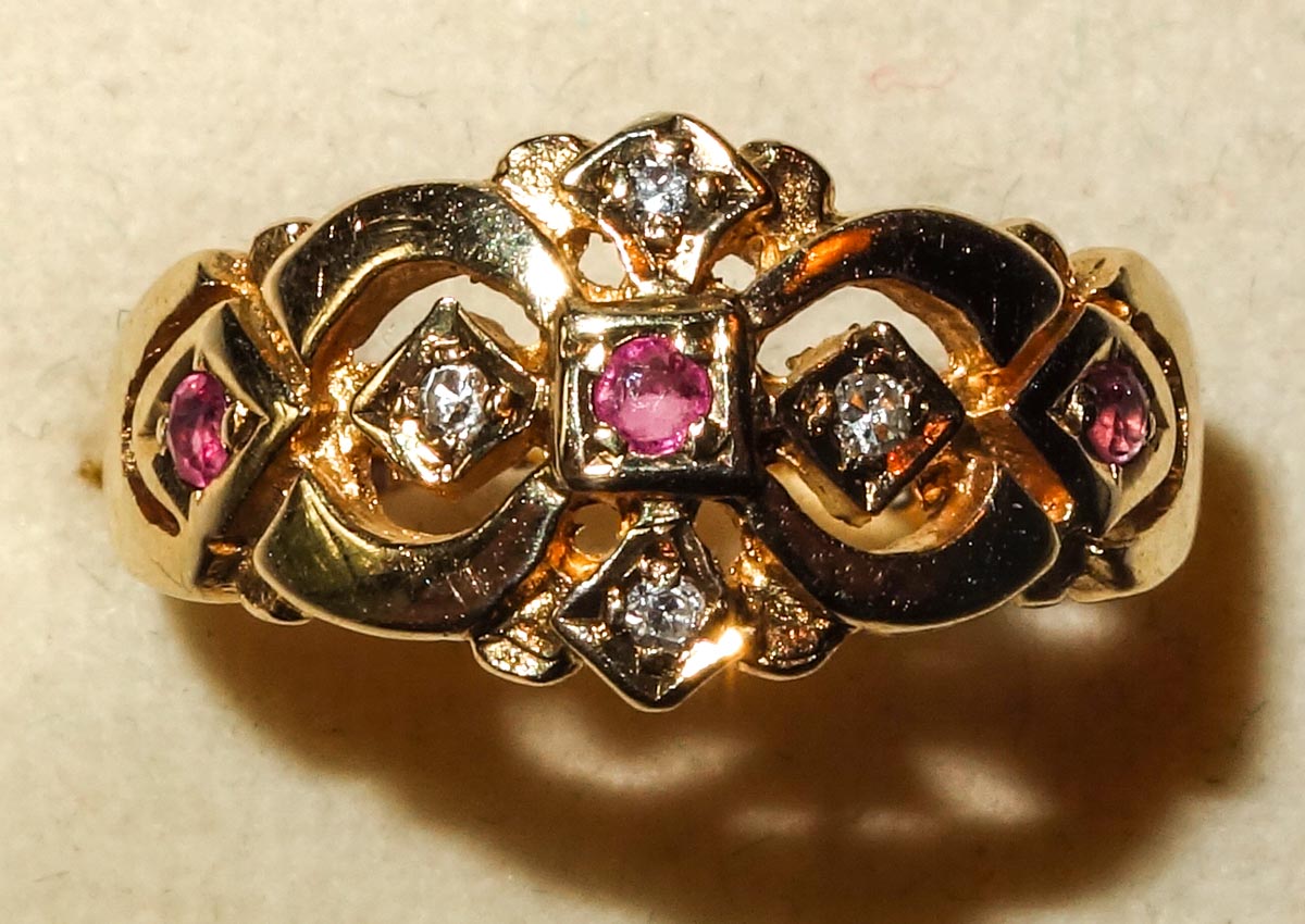 An attractive antique ring of 3 Rubies and 4 diamonds