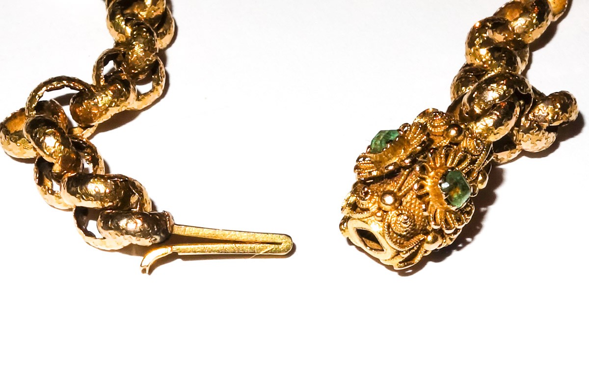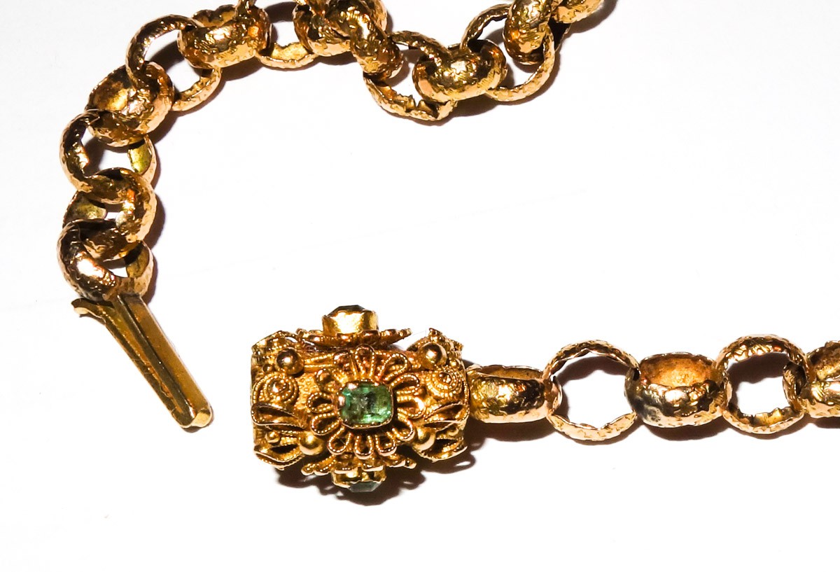 A very attractive Georgian Necklace with a cannetille barrel clasp set with four Emeralds
