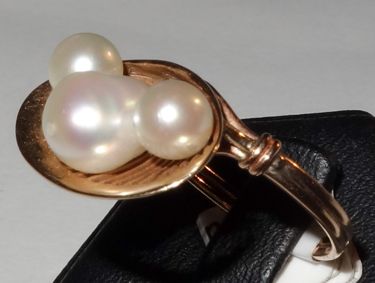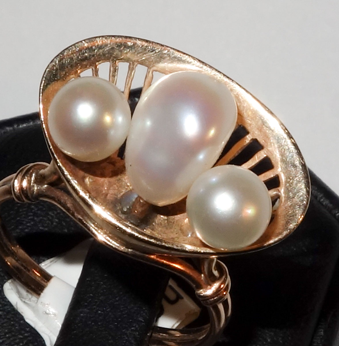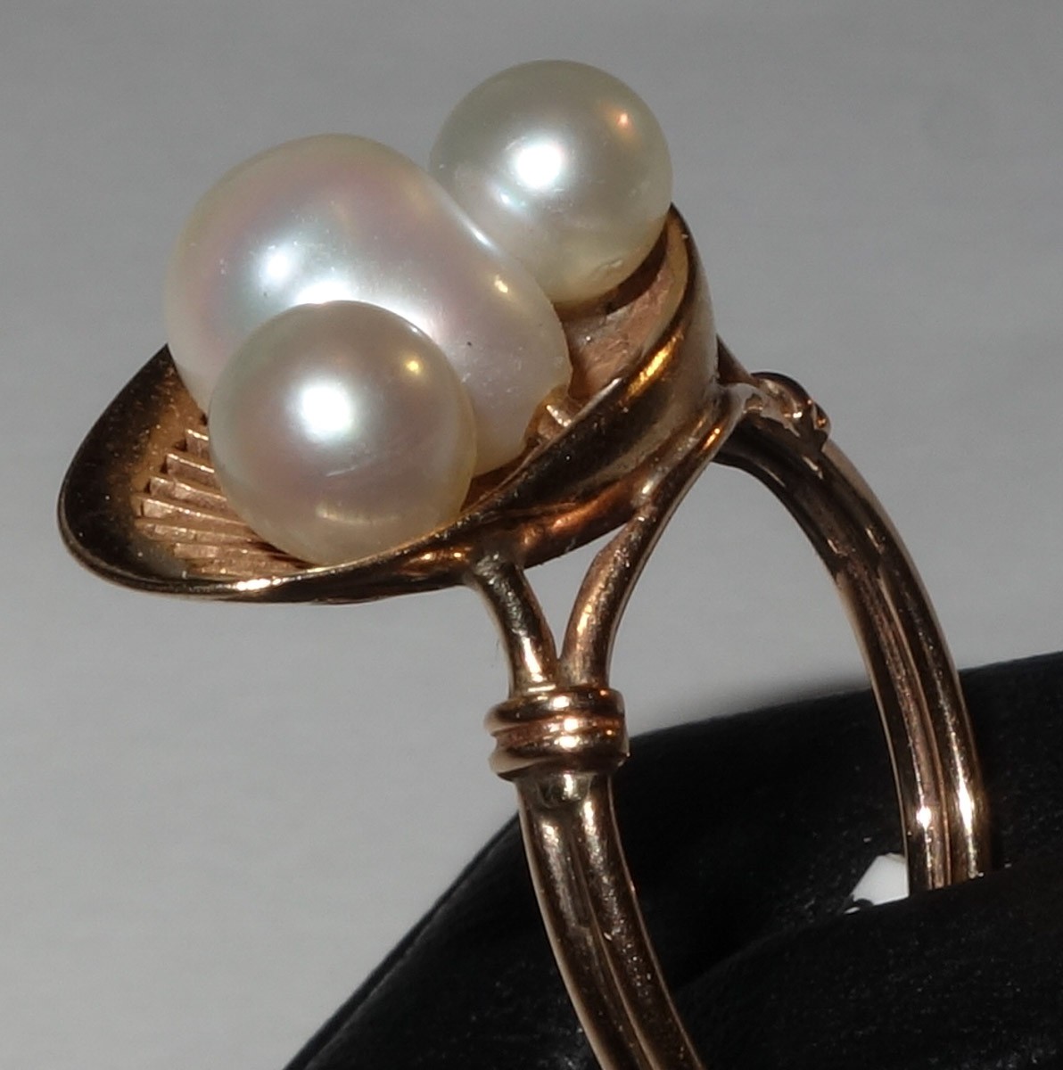 A lovely 14ct yellow gold ring with 3 pearls set in a open design shell mount